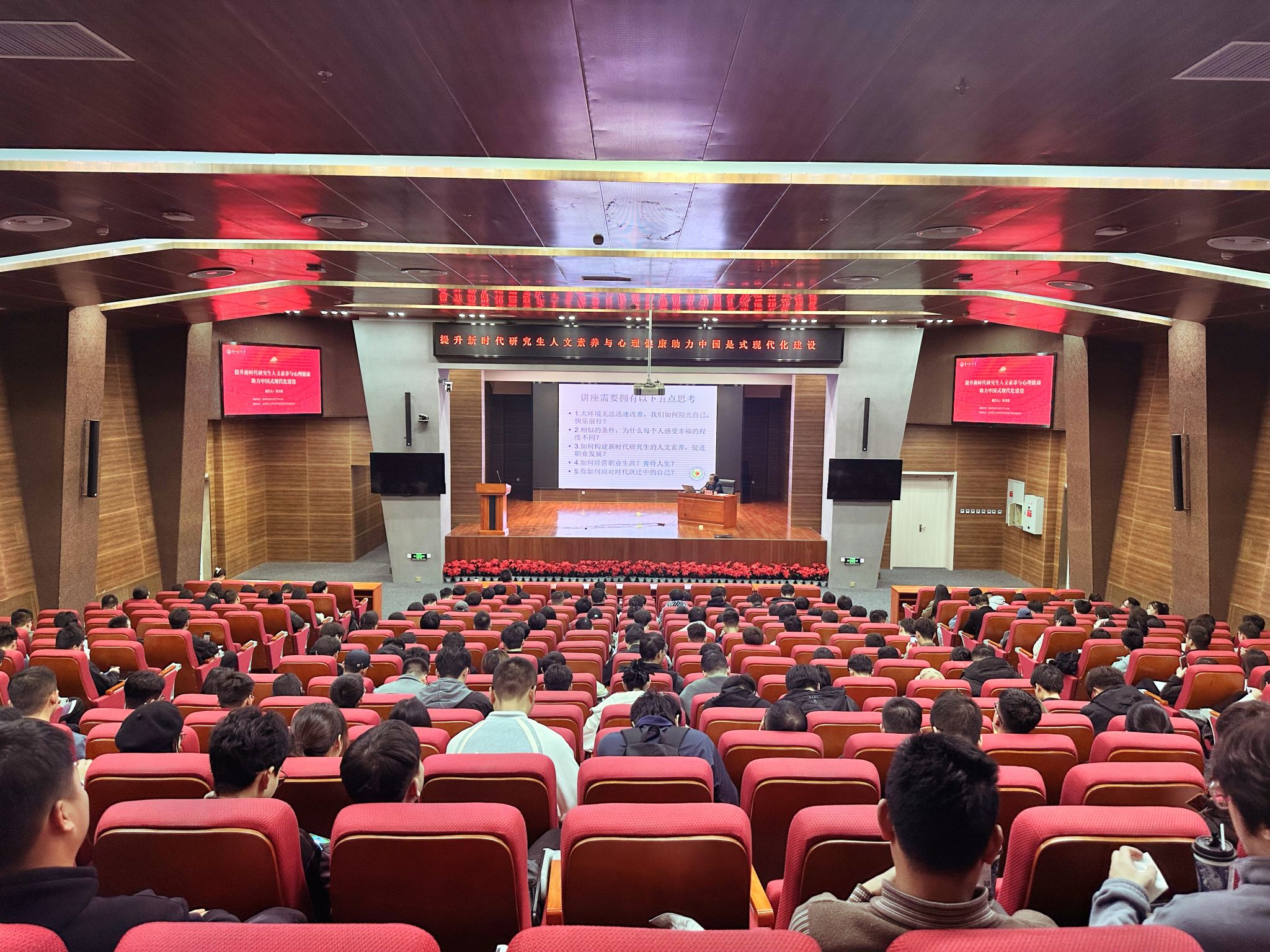 莫兴邦以“提升新时代研究生人文素养,助力中国式现代化建设”为题,报告围绕新时代研究生的使命与挑战、人文素养的内涵与重要性、心理健康的内涵与重要性、新时代研究生人文素养与心理健康现状、提升研究生人文素养与心理健康的策略、人文素养与心理健康对中国式现代化建设的意义等方面为同学们做了精彩的报告。互动环节莫兴邦教授结合中国传统文化和中医养生保健知识,并现场示范和传授了自我心理调适与压力管理技巧,赢得同学们阵阵掌声和一致好评。