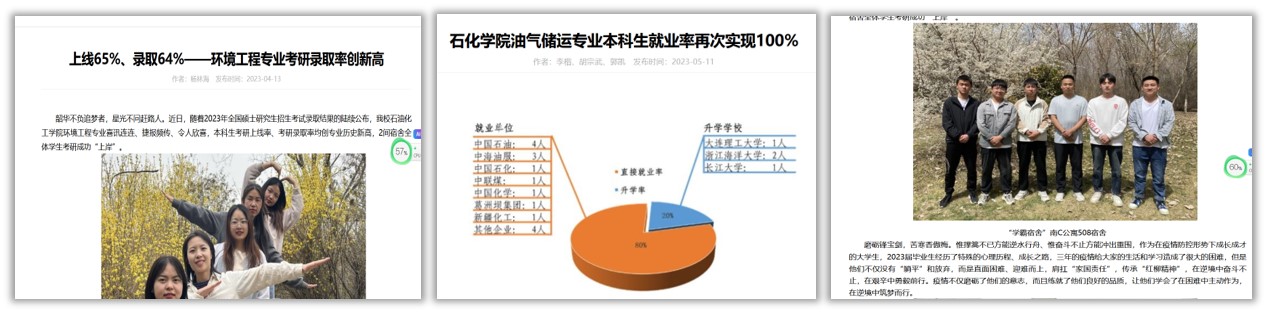近年来,石油化工学院把就业工作作为提升事业发展核心竞争力的重要体现、检验人才培养质量的重要指标和学院最大的“民生”工程,坚持数量与质量并重、考研与择业并举、就业与创业并进,全面履行学院主体责任,充分发挥校园招聘主渠道作用,推动就业率和就业质量稳步提升。学院2023届就业率88.33%,排名全校第一,油气储运工程本科生连续7年实现100%就业;2024年9月1日,学院2024届毕业生就业率87.3%,其中53%的毕业生进入世界500强、行业百强工作,37.7%的毕业生签约央企、国企。