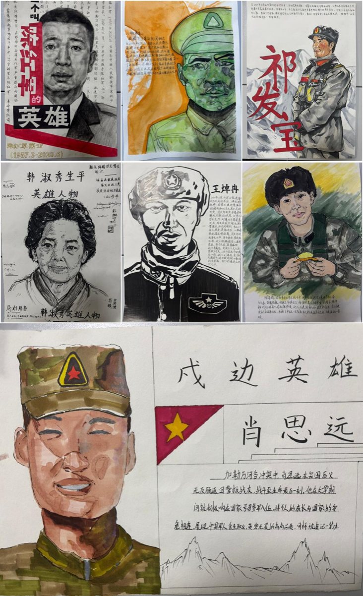 回到学校后,同学们拿起画笔描绘祁发宝、陈红军、陈祥榕、肖思远、王焯冉、韩淑秀、次罗布7位戍边英雄的英勇形象。同时,结合学院的专业特色,设计清明节海报,以独特的艺术形式弘扬英烈精神。