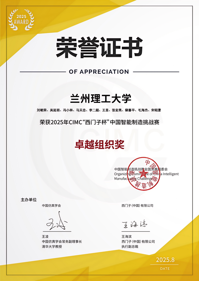 近日,我校荣获2025年CIMC“西门子杯”中国智能制造挑战赛全国“卓越组织奖”,这不仅是组委会对学校赛事组织能力的高度认可,更标志着我校在“赛事组织—教学融合—人才培养”全链条工作取得进一步突破,为智能制造领域人才培育探索出高效路径。同时,我校教师吴延明、刘朝荣荣获“CIMC卓越园丁”称号。