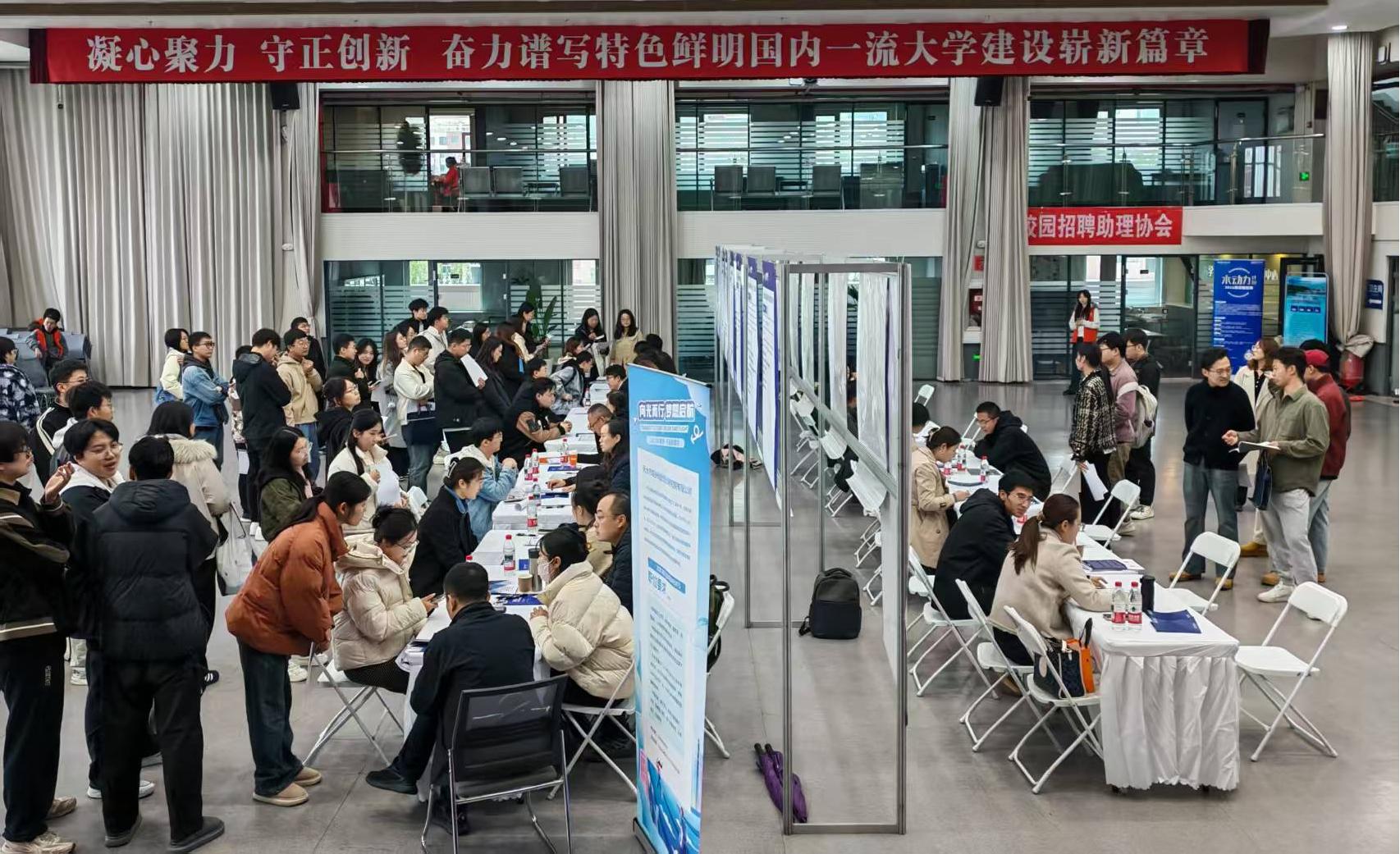 学校学生就业创业服务中心负责人、学院领导班子、学院教师代表和毕业生辅导员在招聘会现场与用人单位交流,为毕业生求职提供指导和支持。