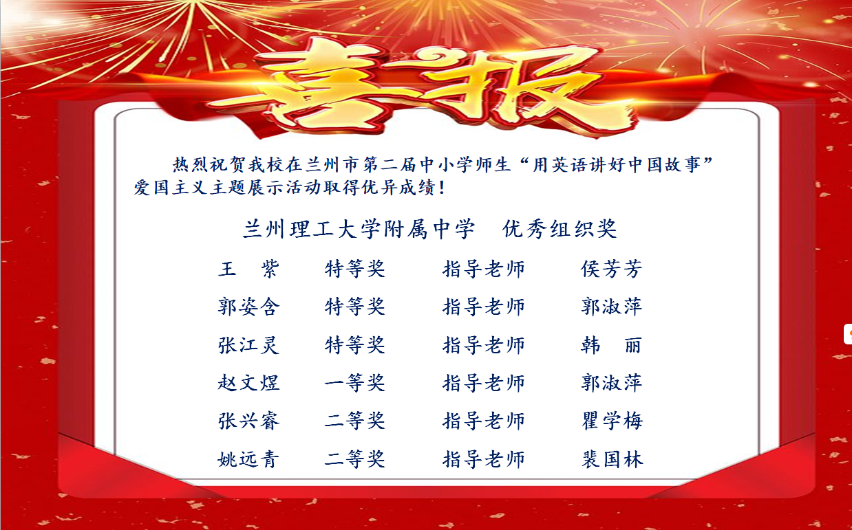 此次获奖,既是对我校英语教学与爱国主义教育融合成果的肯定,也是学校坚持“五育并举”、落实立德树人根本任务的生动体现。未来,兰州理工大学附属中学将继续以多元活动为载体,搭建学生展示平台,引导学生在传承文化中坚定自信,在跨文化表达中拓宽视野,培养兼具家国情怀与国际视野的新时代青少年。(图/文:侯芳芳;审核:杨雅琼)