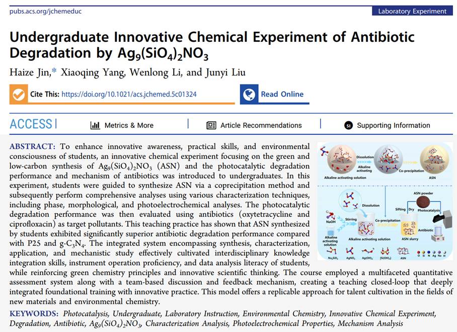 近日,我校材料科学与工程学院金海泽副教授团队,在本科基础训练与创新实践融合教学中取得重要进展,在美国化学会旗下国际化学教育旗舰SCI期刊《Journal of Chemical Education》发表题为《Undergraduate Innovative Chemical Experiment of Antibiotic Degradation by Ag9(SiO4)2NO3》的论文。我校为唯一完成单位,金海泽为第一作者兼通讯作者。