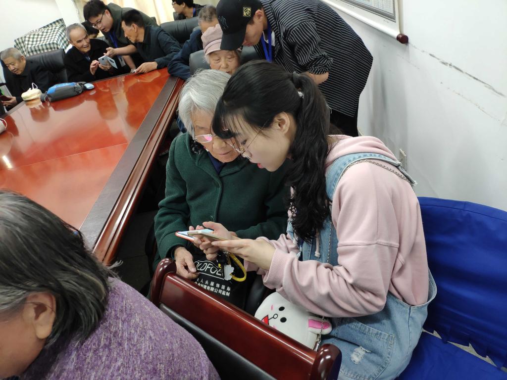 培训现场,台上主讲志愿者演示PPT讲解智能手机的使用方法,台下志愿者同学对老师进行一对一辅导操作,手把手教学。培训内容主要是智能手机最基本的,最常用的,与生活最最贴切的操作技巧。分别为拨打电话、接听电话、添加联系人、手机上网、安装和删除程序、微信的使用、手机拍照等。此次培训共进行4天,尽管学员们的年龄大部分都在七十岁左右,可坐在教室里,每一位都变成了求知欲强烈的“小学生”,不断地向志愿者同学提出使用智能手机过程中遇到的各种问题。