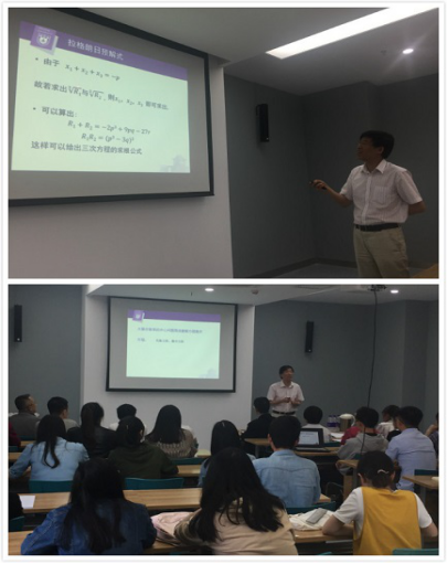 秦厚荣教授以从解方程到伽罗华理论为主题,简要回顾人类解2次,3次4次方程的历史,介绍了阿贝尔-鲁菲尼定理,伽罗华理论。秦教授的报告深入浅出,他生动而充满激情的精彩报告赢得了在场老师和同学们的阵阵热烈掌声,整个过程气氛非常活跃。报告不仅拓宽了师生们的视野,也让师生们深刻感受到在教学、科学研究过程中要勇于创新、善于钻研才能有所收获。