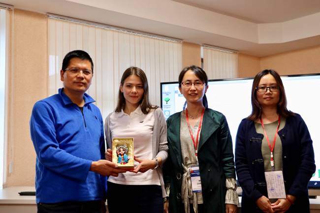 向圣彼得堡矿业大学赠送的兰理工百年校庆Logo T恤衫、学校宣传册和中国元素礼物