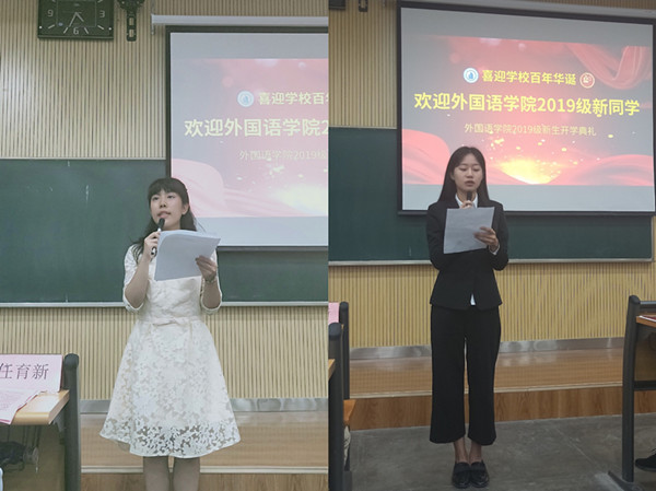 2016级日语专业优秀学生代表王立雪向大家分享了自己的大学经历,她希望同学们能从点点滴滴做起,先定一个小目标,一步一个脚印,脚踏实地朝着目标迈进。17级俄语1班魏晨光同学作为学院新生学生代表上台发言,她不仅表达了对于老师的感恩之情, 也抒发了自己立志成为“遵守行为规范,认真努力学习,尊敬师长,友爱同学,争做品学兼优的新好少年”的决心。19级新生们认真聆听,受益匪浅。
