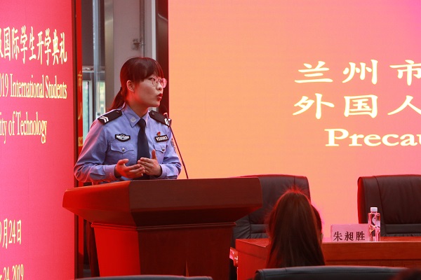 典礼上,甘肃省国际文化交流协会秘书长王晓琴、副秘书长魏明旺为获得2018-2019年度甘肃省国际文化交流协会奖学金的9名国际学生颁发了奖学金,国际教育学院直属党支部书记任鹏为第四届国际学生管理委员会颁发了聘书,兰州市公安局七里河分局警官陈凌作题为《外国人来华的注意事项及应遵守的法律法规》专题讲座。