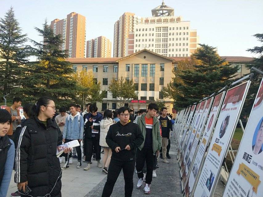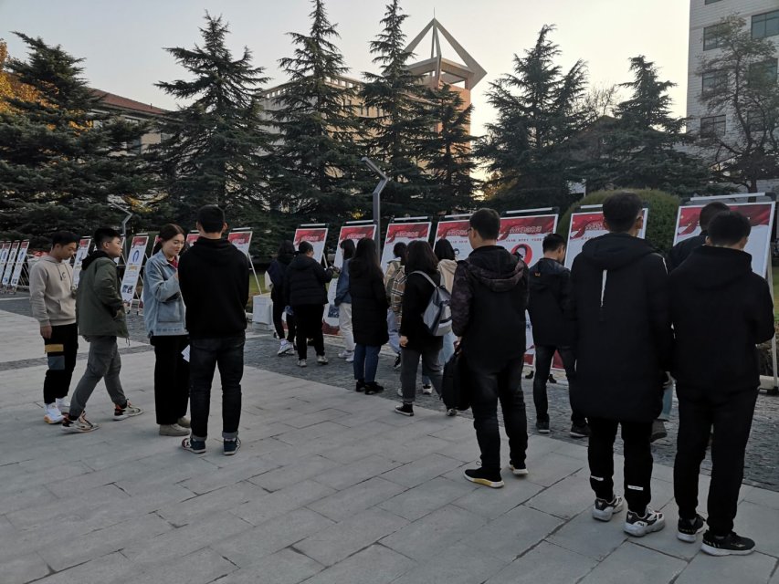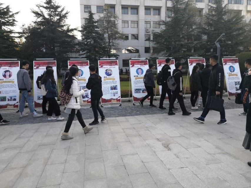 11月11日下午,设计艺术学院组织19级新生在图书馆门前参观优秀教师先进事迹巡展。