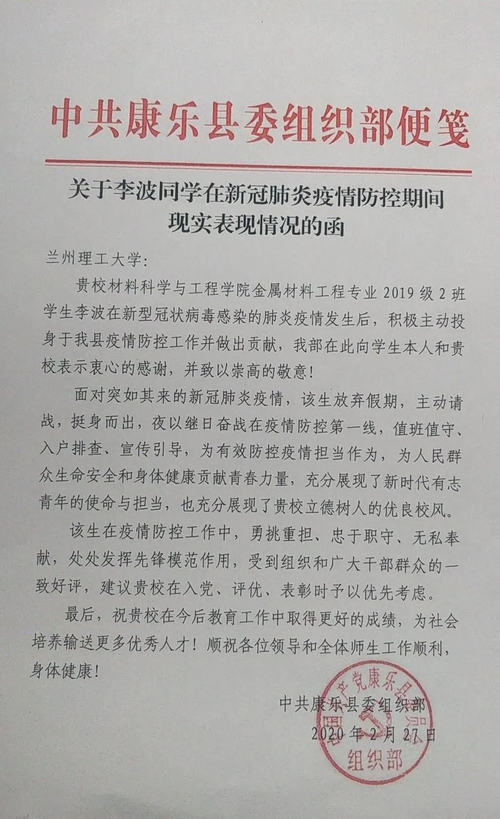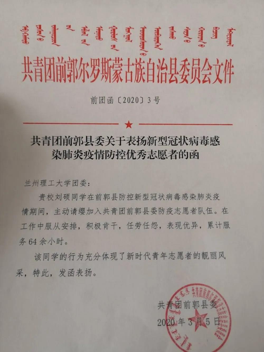 新型冠状病毒的防控战中,材料学院青年志愿者积极投身于抗疫实践中,贡献力量、逆行而上,成为抗疫大考中闪闪发光的年轻力量,并得到的当地政府、社区的认可,在我校学生中起到良好的表率,树立了先锋的榜样。
