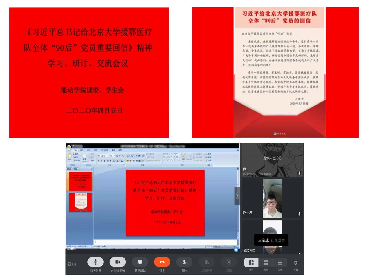 43-420日,能源与动力工程学院团委、学生会组织了学习“习近平总书记给北京大学援鄂医疗队全体90后党员重要回信精神线上学习交流会,同时各班团支部积极开展“习近平总书记给北京大学援鄂医疗队全体90后党员重要回信”精神“@大接龙”活动。通过绘制海报、编写心得体会等方式,表达对对英勇抗疫英烈和最美的逆行者崇高的敬意,同时树立了明确的使命感和责任担当感。