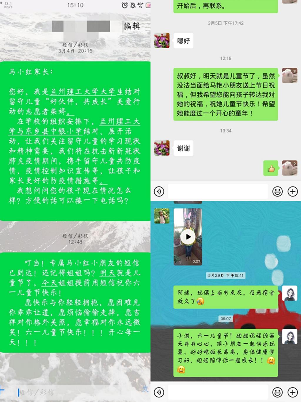为积极响应国家对留守儿童的关注,表达大学生渴望回馈社会的心情以及对祖国下一代健康成长的期望,兰州理工大学经济管理学院优秀学生志愿者自3月初以来,通过微信、QQ、电话、短信“一对一”结对辅导、答疑等形式与东乡族自治县留守儿童成功对接,开启了互帮互助、线上辅导模式,有针对性地帮助孩子们制定假期学习计划,做好特殊时期留守儿童的感情陪伴。