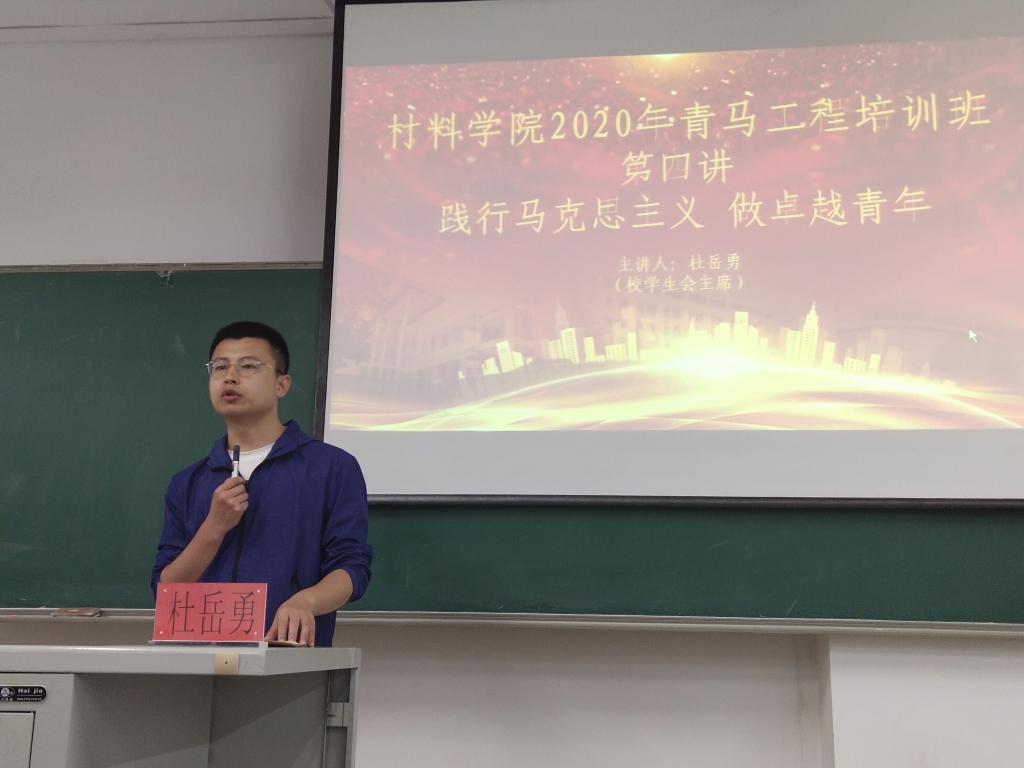 2020年6月22日晚,材料学院2020年青马工程培训班第四讲在西校区集贤楼101教室展开。青马工程第四讲以“践行马克思主义,做卓越青年”为题,由材料科学与工程学院2016级学生、校学生会主席杜岳勇同学主讲。