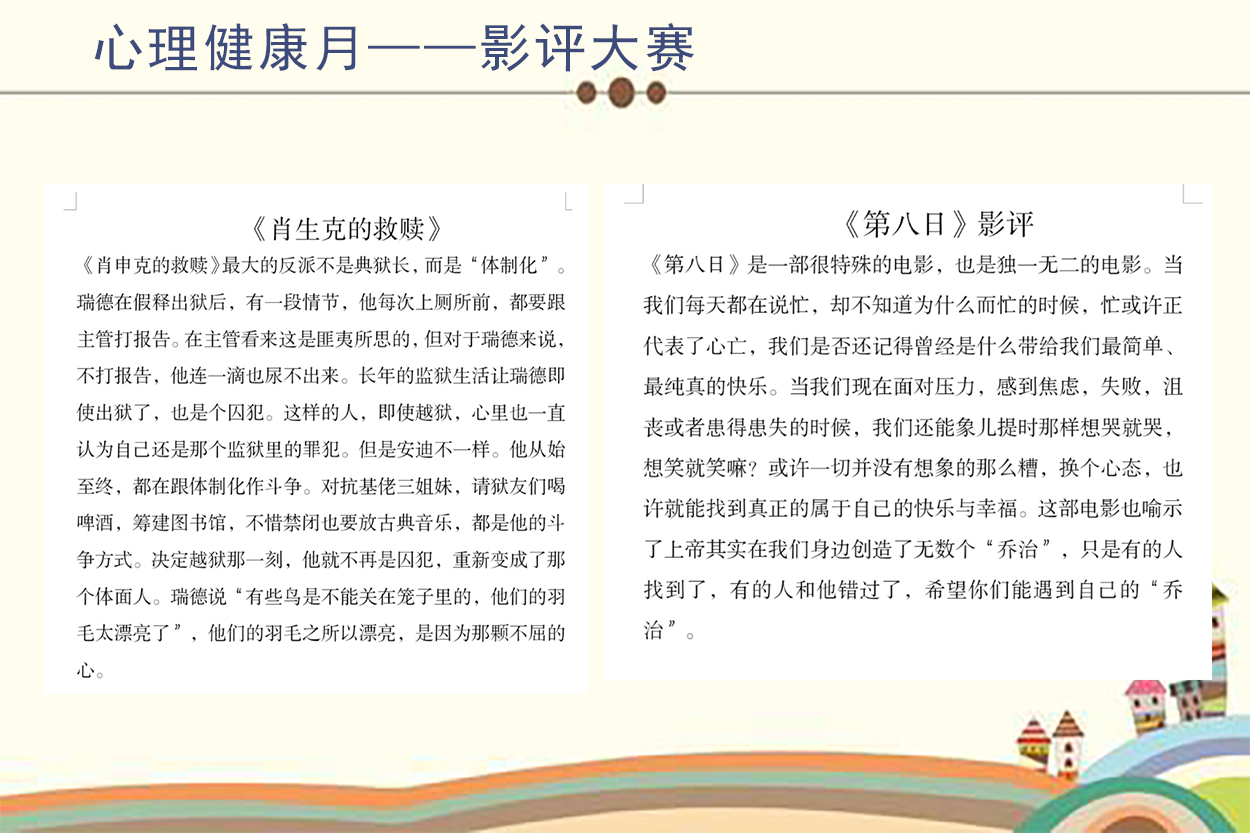 真正的心理电影拥有强大的治愈功能,因此辅导站为同学们推荐了《肖申克的救赎》《美丽人生》《第八日》《阿甘正传》《心灵捕手》等评分很较高且意义深远的电影。观看电影能够使学生站在旁观者的角度认识个体生命周期和心理发展规律,有益于进行自我探索。