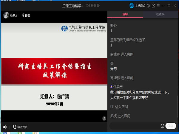 报告结束后,包广清就学生一志愿招录政策、新生奖学金、就业以及博士招生政策等相关问题做了详细解答,为学院学科、招生等工作做了很好宣传。线上夏令营活动,大部分营员表示受益匪浅并且表达了今后在电信学院深造的志向和决心。部分同学也期望以后能与在校硕士、博士优秀生就考研、读研和读博等进行经验交流,使大家对今后硕士、博士期间的科研和生活情况有更加直观的认识和了解。