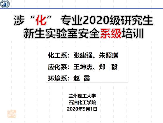 2020年9月1日,兰州理工大学石油化工学院举行“涉化专业2020级研究生新生安全系级培训及师生双选会”。会议由化工系主任张建强主持,全体研究生导师、化学工程与技术一级学科下全部专业和环境工程专业115名研究生新生参加了培训会和双选会。