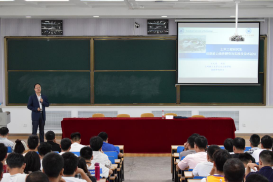 王文达就土木工程学院发展历史、专业发展与进步历程以及教师结构做出了详细的讲述。随后王文达院长对学院近年来平台建设情况进行了介绍,包括国家、省部级教学名师、教育部长江学者创新团队、教育部黄大年式教学团队、省级实验室教学示范中心等,同时向同学们介绍了学院近年来的教学模式改革与发展方向。他说,学术诚信、学术创新是整个社会关注的重要话题,举例分析了当前学术环境之下学术不端的种种失信行为,我们应该保持对学术的敬畏之心,具备自觉的学术规范意识,多读好书,增强学术创新能力,在所学专业的基础上探索自己的研究领域。