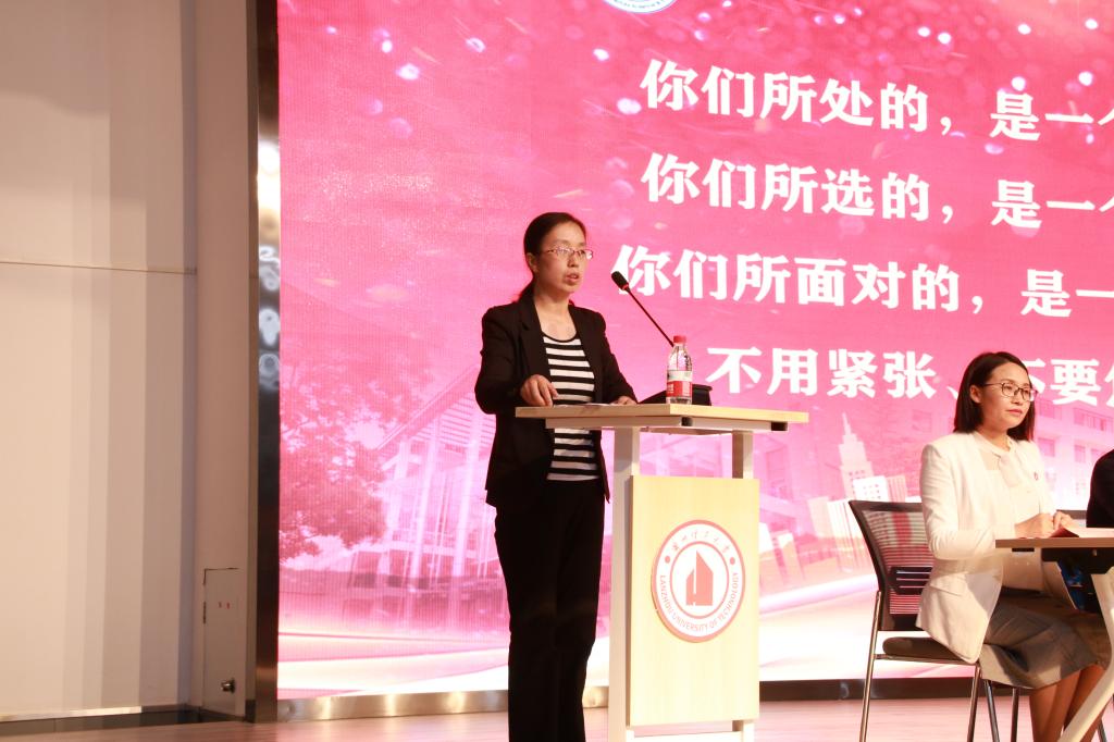 伴随着庄严的国歌声,开学典礼拉开帷幕。曹睿致辞并代表全体教师欢迎新同学。她用亲切的语气、通俗的话语对同学们谆谆教导——站在中国几何版图中心兰州,怀揣梦想与希望,选择奋斗的青春。同学们所处的是一个日新月异的时代,所选的是一片奋进求是的热土,面对的是一个焕然一新的角色,面对未知且具有挑战的未来,她告诉同学们不必紧张、不要焦虑、不用迷茫。最后,曹睿殷切地希望同学们的奋斗为青春唱响,乘风而起、绽放青春,谱写无悔华章。