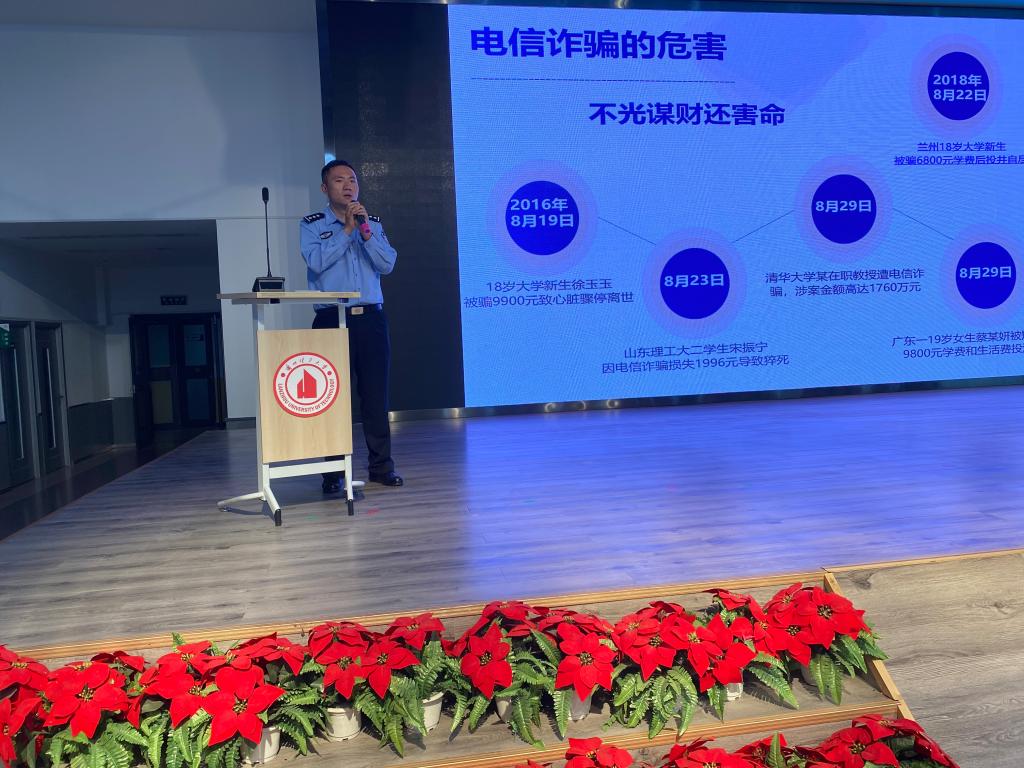 朱警官详细讲解了电信诈骗的危害性、常见电信诈骗案例、应对电信诈骗的方法,提醒同学们多与家长沟通,不贪图小利,文明健康交友,必要时拨打公安机关110报警电话需求帮助。