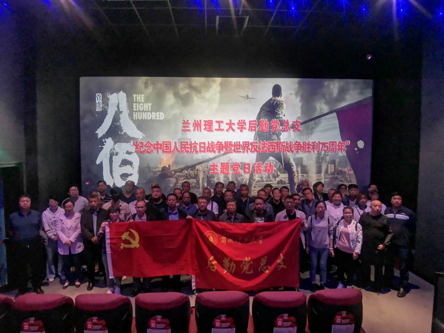 为了纪念中国人民抗日战争暨世界反法西斯战争胜利75周年,回顾中国革命历史,向革命英雄致敬,进一步加强党员、入党积极分子的思想教育,弘扬爱国主义精神,9月15日下午,后勤党总支共50余名党员及入党积极分子集体观看爱国主题教育影片《八佰》。