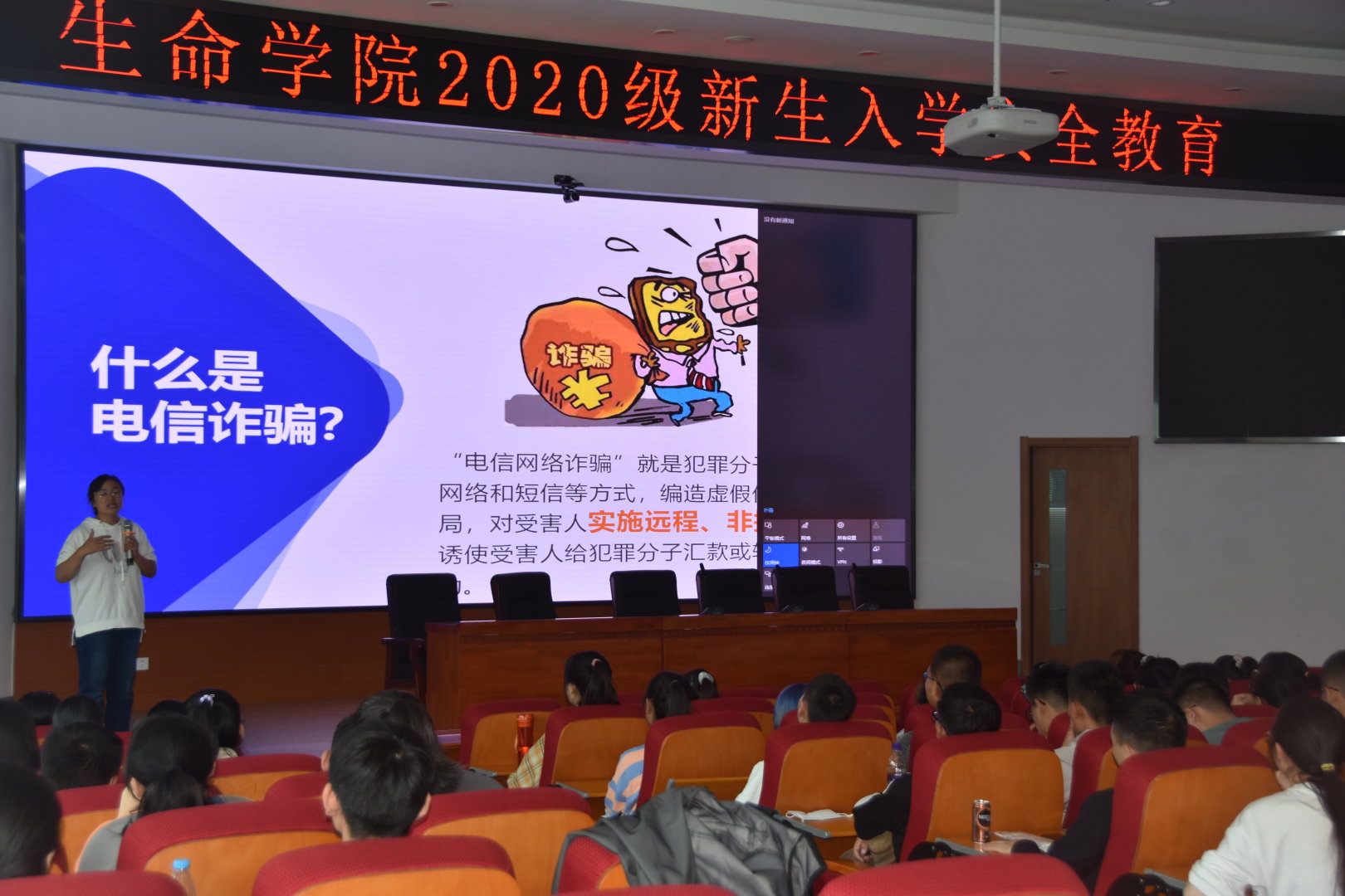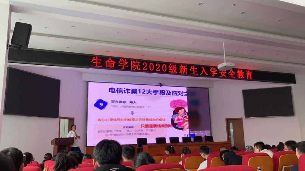 为提升2020级新生对电信诈骗活动的防范意识和辨别能力,生命学院于2020年9月12日在校本部图书馆二楼报告厅开展新生入学安全教育。由辅导员唐爱丽主讲。