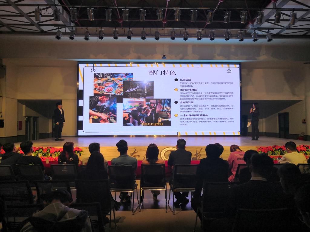 宣讲会上,学生干部依次上台,以视频、PPT、音乐等多种形式向2020级新生介绍各部门的工作职责,讲解了各部门的工作特点,展示了他们通过学生工作得到的锻炼和成长,解答了新生的疑问。