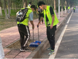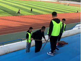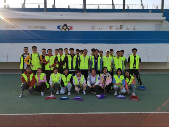 在活动过程中,各志愿者热情洋溢,积极地进行清扫活动,展现了新时代青年大学生精神饱满、意气风发的良好状态。首先,志愿者们分批次进行田径场周边道路的清扫,他们或是用扫帚堆起沉积的落叶,或是用手捡起来路边的垃圾。随后,在田径场内部对跑道、看台进行彻底清扫。志愿者们配合默契,在相互帮助中感受到了集体的力量。