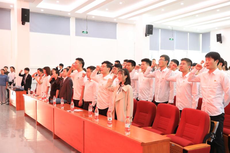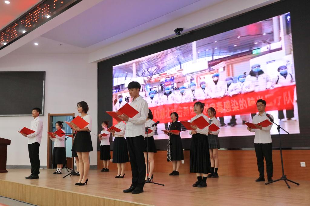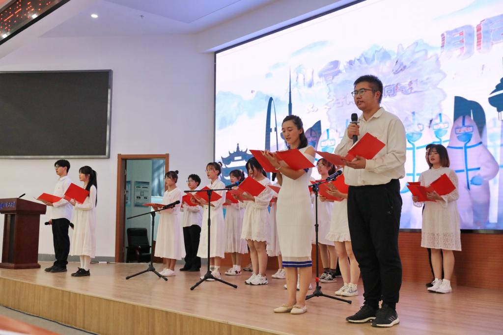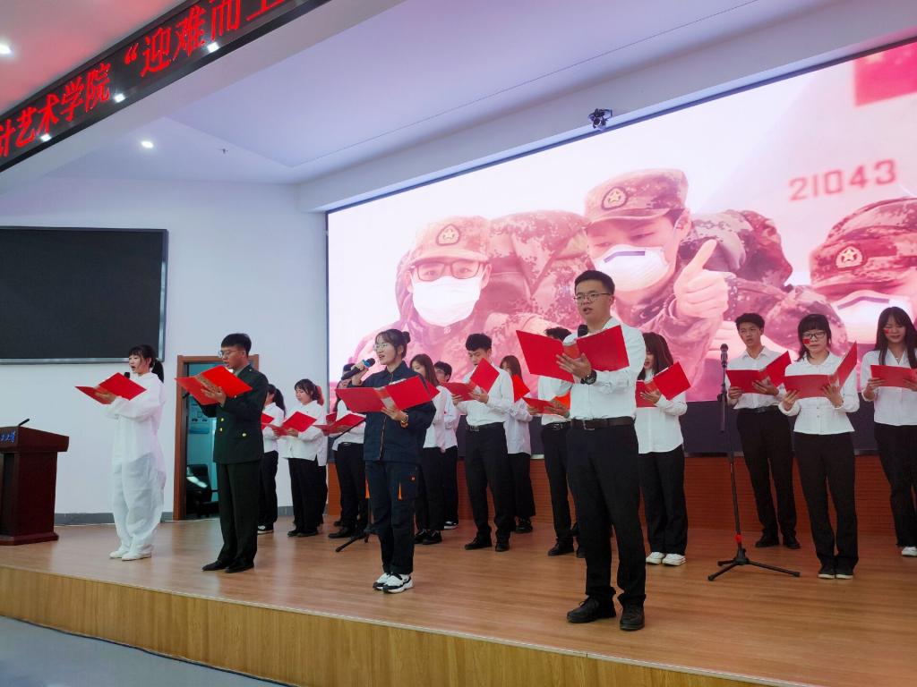 随着《义勇军进行曲》旋律的响起,在场所有人自豪地唱起国歌。礼毕之后进入第二项,在场所有党员重温入党誓词,由学院辅导员、支部书记周佩老师领誓,带着鲜红的党徽,大家带着真挚的感情,炙热的爱国爱党之心郑重宣誓,深情地表达对党和国家的热爱。接着,一段开篇视频将所有人带回了疫情防控的最艰难时刻,我院党员志愿者在疫情防控中的点点滴滴在荧幕前划过,在场所有人既感动又敬佩。