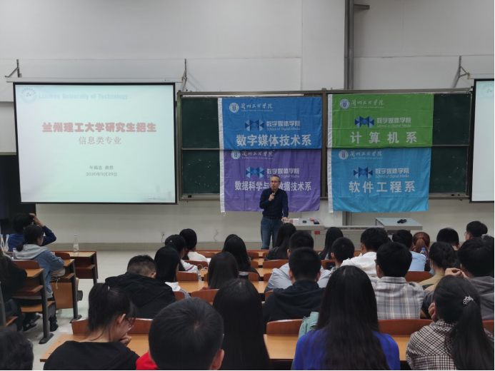 9月29日,计通学院院副院长年福忠教授走进兰州文理学院数字媒体学院,展开了研究生招生宣讲活动。兰州文理学院数字媒体学院院长李恒杰教授以及软件工程、数据科学与大数据技术、数字媒体技术专业有考研意愿的学生200余人参加了此次会议。
