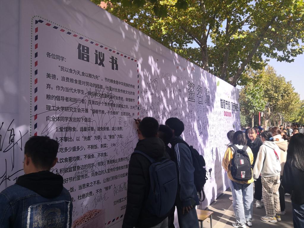 10月16日,在第四十个世界粮食日来临之际,校研究生会在兰工坪校区6号楼前开展了“惜粮节粮,不负粮辛”主题宣传活动,现场有近千名同学参与了此次活动。