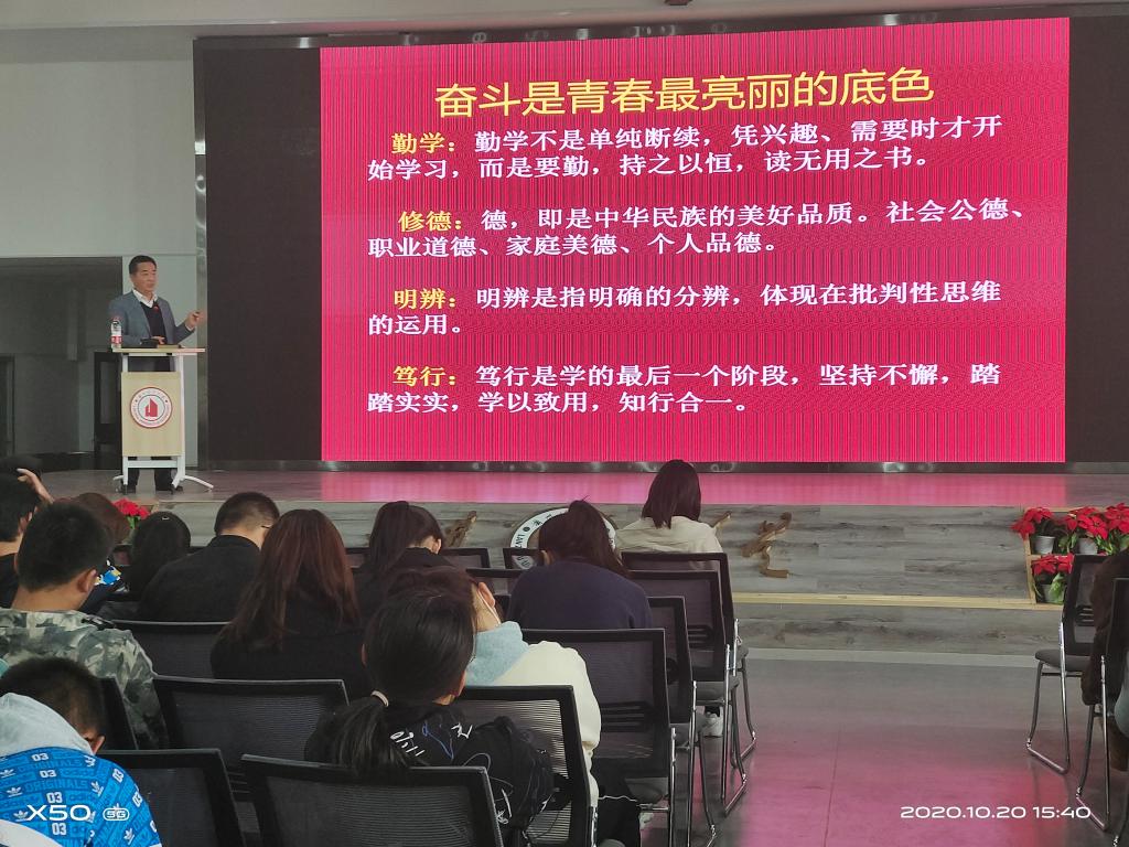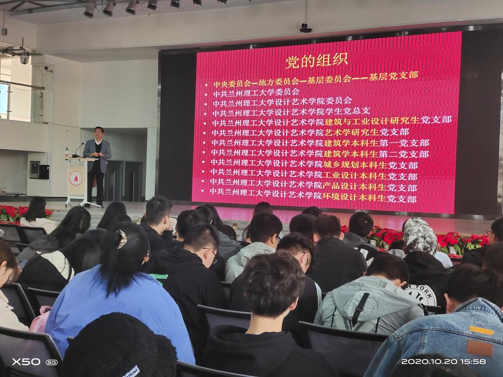 2020年10月20日,设计艺术学院在兰工坪校区大学生活动中心开展了2020级新生入党启蒙教育,学院齐伟建老师主讲,学院2020级新生和各党支部代表参加了讲座。
