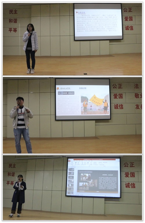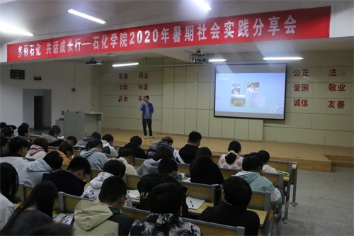 根据《在疫情防控常态化形势下做好2020年全国大中专学生志愿者暑期文化科技卫生“三下乡”社会实践工作》的要求,石油化工学院于今年暑期组织了28支分散实践团队围绕“投身脱贫攻坚”、“助力疫情防控”、“文明志愿服务”等内容,开展了主题鲜明的社会实践活动。为进一步扩大此次社会实践的育人效果,引导鼓励更多同学在社会实践中受教育、长才干、作贡献,10月20日下午,石化学院在彭家坪校区集贤楼108教室组织开展“多彩石化,共话成长行”2020年暑期社会实践分享会,邀请了分散社会实践团队队员代表为2020级全体同学分享了各自的实践经历,活动由学院19级辅导员朱柯宇主持。