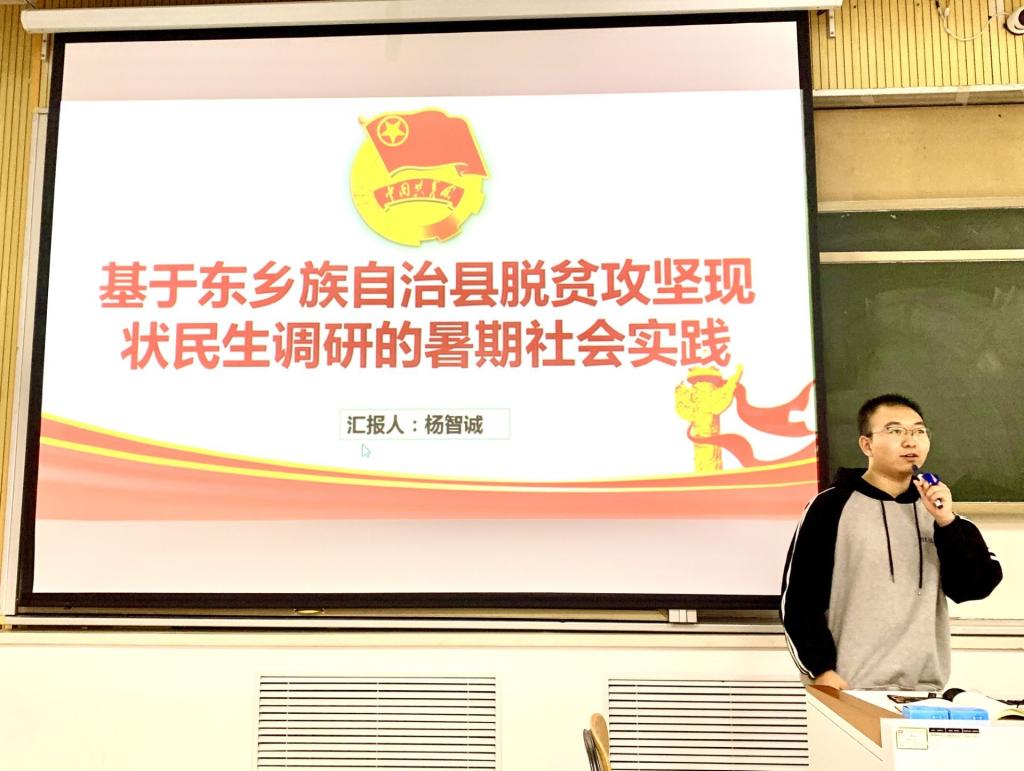 特色农业调研队讲述了有关东乡族自治县脱贫攻坚的调查报告,报告指出东乡县脱贫主要依靠发展地域特色农业与企业帮扶,其中东乡县的特色脱毒马铃薯、金银花等都取得了不错的收益。东乡民生调研队先后采访了民政局、脱贫办的工作人员,对东乡县的民生有更进一步的了解,社会实践可以更好地让同学们了解国情社情,呼吁大家积极参加,投身祖国建设。科技兴农调研队展示了对陇南市武都区的特色花椒产业调研,科技兴农是脱贫的好帮手,武都区通过科技产业支农已达到全线脱贫摘帽。民勤县生态脱贫调研队走访了当地农业企业,深入了解干旱地区通过产业走环保脱贫之路的特色方法。