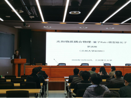 首先,罗洪刚作了题为《光和物质耦合物理-量子Rabi模型极化子》的学术报告。报告中,罗教授介绍了量子Rabi模型(QRM)的发展进程,对QRM模型的基本组成进行了分析,展示了使用变分波函数提出的QRM中变形极化子和反极化子的图像。在此基础上,讨论了基态能量及其可观测性、波函数相位图的变化等。报告结束后,物理系师生就自己的研究方向同罗教授进行了探讨,他就做基础研究的特点和乐趣分享给了大家,并就双方团队的进一步合作提出了很好的建议。