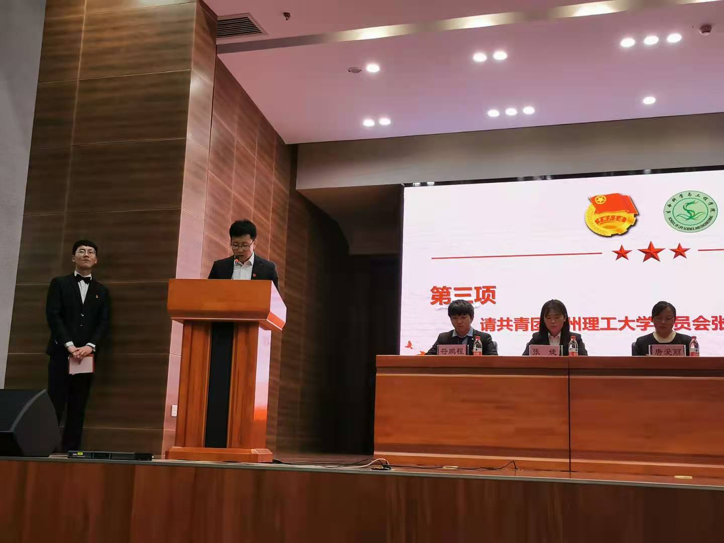 大会第一阶段在庄严的国歌声中拉开序幕。首先,由唐爱丽致大会开幕辞,要求各位代表充分行使自己的民主权利,将此次大会开成一个民主、团结的大会。张晓锋代表学校团委对生命科学与工程学院团学工作做出充分肯定,希望今后生命学院的团学工作把新时代党的建设的新要求贯彻落实到团的建设中,着力提升团学组织力和战斗力。李萌代表校学生会为我院两代会的顺利召开送上诚挚的祝福。随后,会议听取了唐爱丽第十五次团委工作报告和上一任学生会主席张婕做的第十六次学生会工作报告。最后,武军莉对我院上届两委会工作做了充分肯定,希望新一届的两委会能在原有工作的基础上有选择的继承,有原则的创新,为生命学院的团委、学生会工作再创佳绩。最后,武军莉和张晓锋向第十五次团委书记团成员和十六次学生会主席团成员颁发证书及纪念品,并合影留念。
