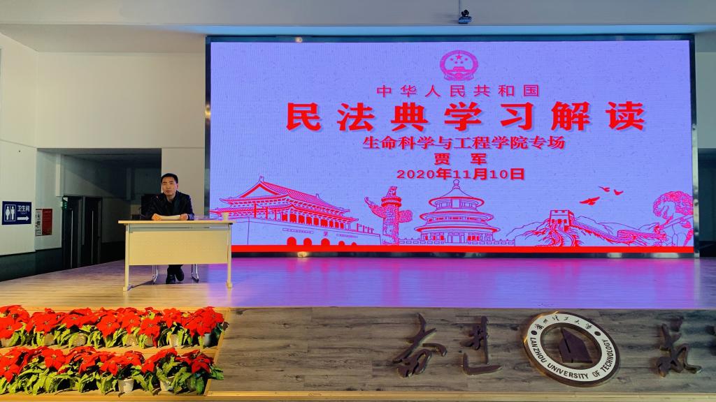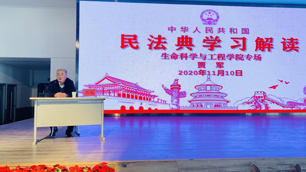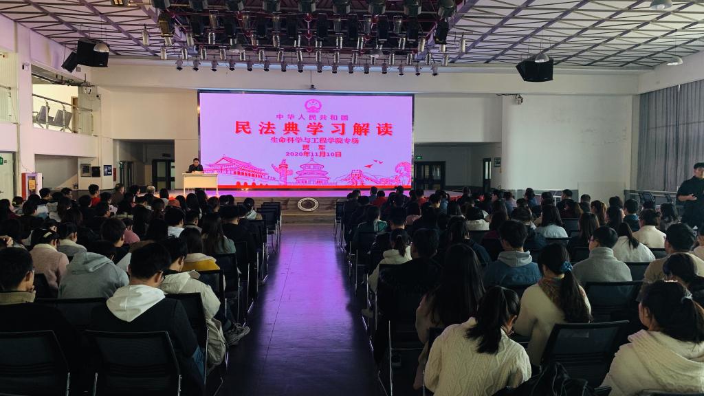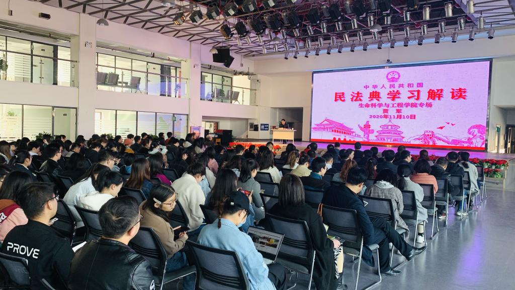 为深入贯彻习近平总书记关于宪法法律和民法典的重要指示精神,切实做好宣传和贯彻实施民法典工作,推动生命科学与工程学院各系宣传、推进、普及民法典,促进师生做学习、遵守、维护民法典。11月10日,学院组织举办生命科学与工程学院第一期《党校大讲堂》,邀请学校总法律顾问贾军教授进行了《民法典》解读学习。学习活动由学院党委书记陈永泰主持,学院师生党员、全体教师及研究生近200余人参加学习活动。