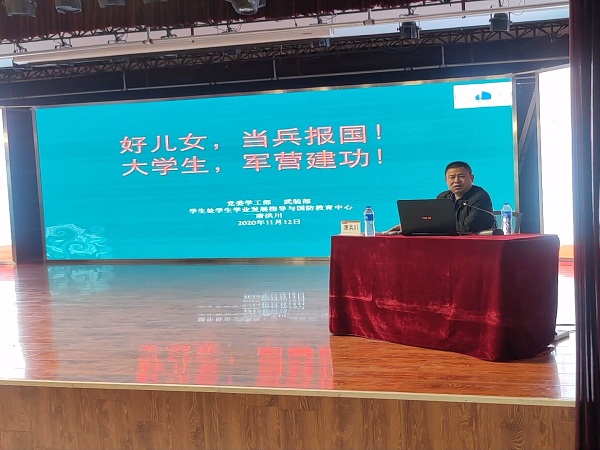 活动中,唐洪川主任作了“好儿女,当兵报国!大学生,军营建功!”主题教育报告,从《退役军人保障法》、大学生征兵工作流程、国家及学校应征入伍相关优惠政策等方面为同学们展开了全面讲解。讲座以问题为导向,针对同学们最为关注的现实问题进行了详细解答,分析透彻,道理深入浅出,形式图文并茂,让大家受益扉浅。最后,唐洪川主任寄语同学们:生活让人历练,让人成长,让人珍惜!在单调的生活中寻觅风景,你会收获美好;在繁杂的生活中追求简单,你会收获思想;在苦涩的生活中品味感动,你会收获幸福。