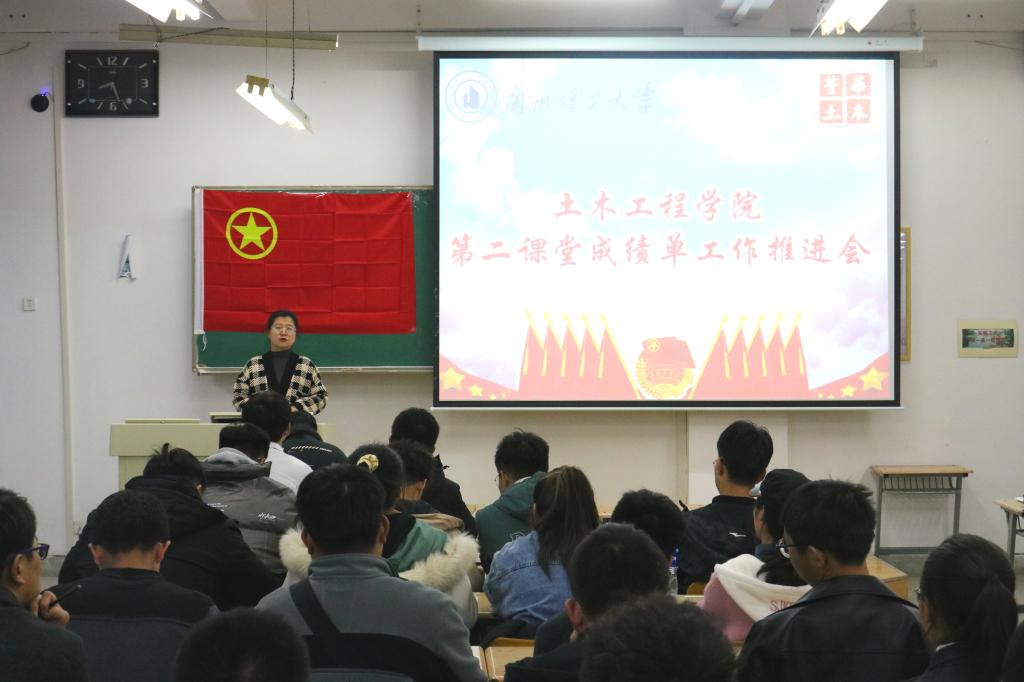 为构建更加完善人才培养体系、实现立德树人根本任务。为学生的成长成才提供丰富的载体,提升其爱国情操、人文素养和科学精神,在第一课堂外持续强化课程思政效果提供实现的路径和可能。土木工程学院于11月12日在彭家坪校区观成楼举行第二课堂成绩单推进会,此次会议由王丹老师主持,18、19、20级全体团支书参加此次会议。