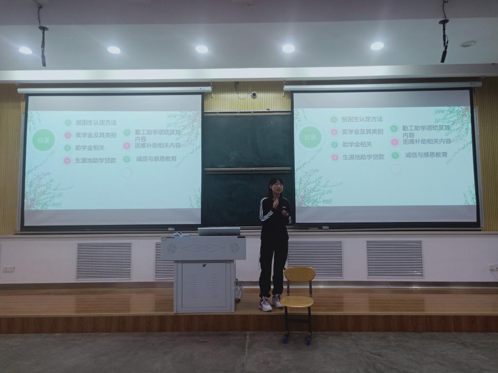 周佩老师剖析了大学生恋爱原因,讲解了恋爱动机、恋爱的阶段,列举了错误的恋爱观,通过真实、鲜活的事例引导广大学生树立正确的恋爱观,正确处理同学间的人际关系。杨凝老师从贫困生认定方法、奖学金及其类别、助学金、生源地助学贷款、勤工俭学活动、困难补助、诚信与感恩教育七个方面进行讲解,教育引导广大学生努力学习,积极参与各类实践活动,以优异的表现获得各类奖助学金。