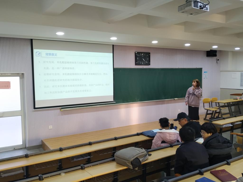 本次报告的主讲人在报告过程中,思路清晰,态度严谨,不但将自己的现阶段成果讲解的通俗易懂,同时也展现了他们个人的风采,给在座的老师和研究生都带来了很大的震撼,起到了很好的模范带头作用。唐丹老师对秦岭链霉菌H2S5中活性成分进行研究,并创新地与生物合成相结合,扩宽了学院师生的科研思路;郭晓鹏老师介绍了重离子束辐射的微生物学效应,通过自己的研究成果生动地介绍了重离子束辐射诱导的致死、修复及突变作用;杜娜娜同学分享了自己研究苯乳酸抑制百合鳞茎米根霉的作用机理的进展并与在场师生交流日常实验过程中的心得;王莉同学主要介绍了食品加工副产物资源化利用的实验思路与目前课题进展,以及在阅读与写作方面的的心得体会;郭小洁同学向大家介绍了微生物基因工程及植物病原微生物代谢调控,并以自己投稿论文的经历,与大家交流综述类文章的写作与投稿的经验。在场聆听报告的各位老师都格外严肃认真,毫不懈怠,随时记录下报告过程中的存在的疑问或者感兴趣的点。同时,在场的同学们们更是听的津津有味,聚精会神,生怕错过优秀的经验和结论。在主讲人结束报告后,老师们与同学们都会结合自己的想法提出一些问题或者建议,并与主讲人深入探讨,交流过程轻松愉快,充分体现出学院师生间良好的沟通氛围。生命科学与工程学院伍国强院长对本次学术交流进行了总结,并肯定了此项活动的意义,同时对未来做出了展望。