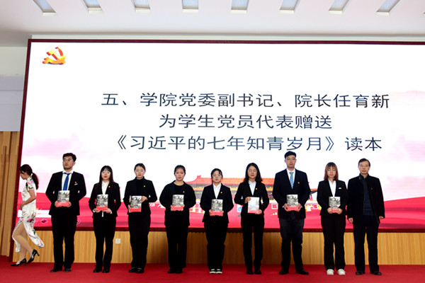学院院长任育新为学生党员代表赠送《习近平的七年知青岁月》读本