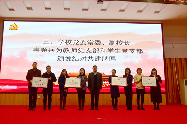 韦尧兵为教师党支部和学生党支部颁发结对共建牌匾。党渭平为教师党员代表赠送《习近平总书记教育重要论述讲义》读本。任育新为学生党员代表赠送《习近平的七年知青岁月》读本。