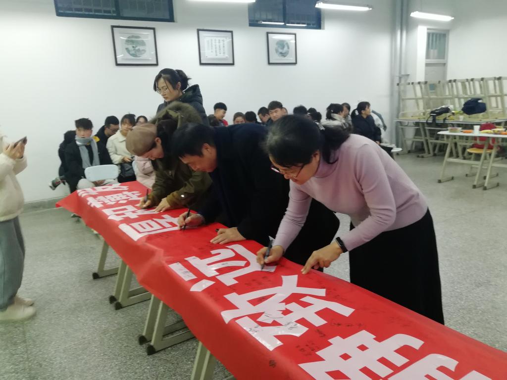 俞树荣对同学们在过去一年学风建设方面取得的成绩和本次活动的精心策划表示肯定,他通过例举两名学生从不适应大学生活到成功逆转的故事,鼓励同学们要热爱大学和专业,通过勤奋努力赢得精彩人生,将班会气氛推向高潮。大家一起观看了同学们自编自导的心理剧短片《热爱》,石易迪同学分享了视频制作的初衷“一个人可以走得很快,但一群人会走得更远”,让同学们认识到了班级团队凝心聚力的强大和震撼。俞树荣和武军莉对本次班会进行了总结,对食品科学与工程一班寄予厚望,鼓励同学们明确目标,奋勇前行。班会结束后,全体师生一起在学风建设倡议上签名,并合影留念。