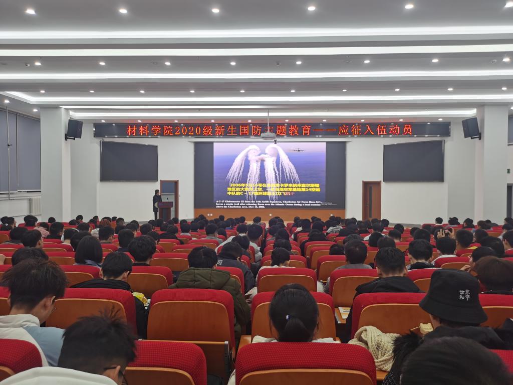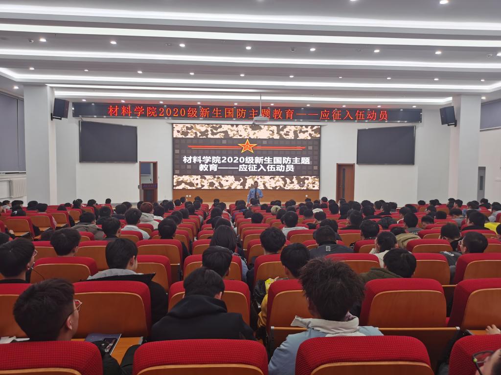 为进一步贯彻落实国家大学生征兵入伍政策,鼓励和引导学生应征入伍,2020年12年23日晚,材料学院在图书馆二楼报告厅开展2020级新生国防主题教育。此次教育讲座由辅导员马忠宝主持,特邀学生处学生学业发展指导与国防教育中心主任唐洪川主讲,邀请优秀退伍大学生肖生祖和蒲文斌分享入伍经历,2020级全体同学参加。