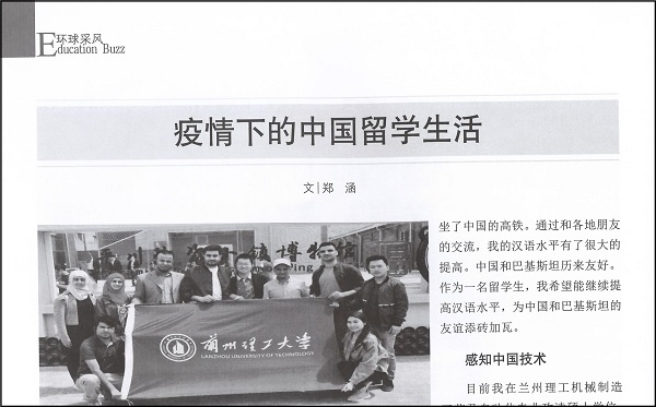 《疫情下的中国留学生活》一文,通过汉语学习经历、感知中国文化、助力环境保护、抗击新冠疫情等版块,郑涵从自己的视角阐释了在中国留学期间的所见所闻。他表示,2020年5月,习近平主席给巴基斯坦留学生的回信充分展示了中国对国际学生的关心,作为这一切的见证者他倍感荣幸,感谢中国政府和兰州理工大学为其提供的学习机会。全文如下: