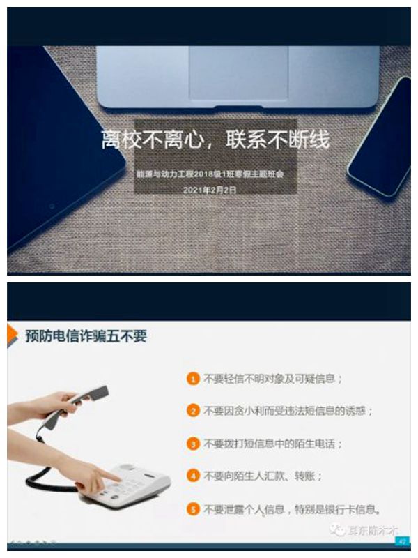 会上,杨育鹏通报了班级学生参保情况,团支部书记张国梁对应征入伍政策进行了宣讲,组织委员曹植韬分享了电信诈骗等安全常识,学习委员姜发通报了上学期期末考试情况,副班长李志宇介绍了如何做科创和参加学校假期创新创业讲堂等活动的重要性。班主任带领同学们学习了2021年寒假高校大学生健康生活提示要诀,并指出,同学们要提高认识,遵守学校和当地疫情防控各项要求,做到非必要不外出,如需外出向辅导员报备行程,积极参加防疫志愿者活动,为共同抗疫贡献自己的力量;要养成良好的作息规律,充分利用假期宝贵的时间,多读书,多学习,为求职或者考研做好充分的准备,特别是挂科门次较多的同学要引起高度重视;要提高安全意识,筑牢安全防线,特别是要谨防电信诈骗;要响应国家号召,积极报名参加2021年大学生征兵,为建设国防强国做贡献;要做一些力所能及的家务,锻炼身体,增强体质,增强劳动意识。
