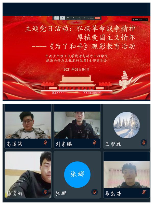 为弘扬伟大抗美援朝精神,厚植大学生爱国主义情怀。2月4日晚上,能源与动力工程本科生第1党支部在线上举办观看《为了和平》主题党日活动。支部全体成员参与活动,活动由支部书记赵继国主持。