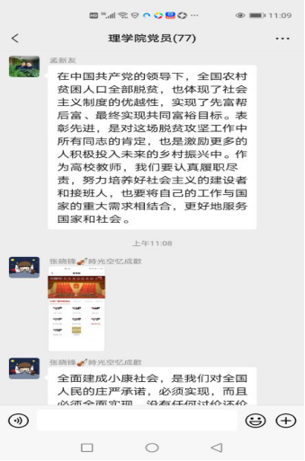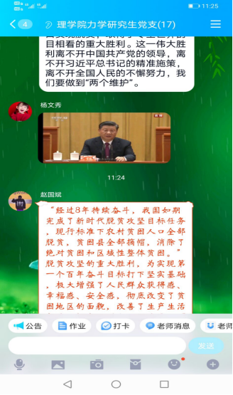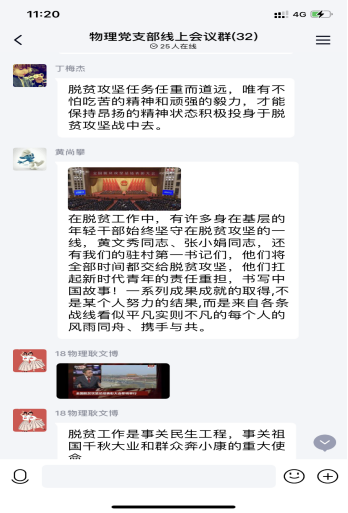 在中国共产党的坚强领导下,全国近1亿贫困人口全部脱贫,第一个百年梦想如期实现。在观看直播的过程中,理学院党委各党支部开展了热烈的讨论交流,大家有感于自己家乡面貌的改变、脱贫攻坚先进个人的感人事迹,同时结合脱贫攻坚主题电视剧《山海情》等畅谈对脱贫攻坚的感受。力学研究生支部曹晨曦表示:对脱贫攻坚的感受在于家门口越来越多来自农村的农贸产品在出售。从农民们的言语中感受到农村现在路修的好了,种地种菜养猪养鸡有人指导帮扶了,日子也越来越好了。本科生物理支部徐顺芳表示消费扶贫让贫困群众搭上了快车,让群众的腰包鼓起来了。教师党员张晓锋表示全面建成小康社会,是我们党对全国人民的庄严承诺,必须实现。理学院党委书记李建东表示:历史伟业充分体现了集中力量办大事的体制优势和中国共产党人咬定青山不放松的精神品格。我们一定要紧密团结在以习近平同志为核心的党中央周围,继承发扬好脱贫攻坚精神,紧紧围绕立德树人根本任务,努力培养德智体美劳全面发展的时代新人,为建设现代化国家做出应有的贡献。