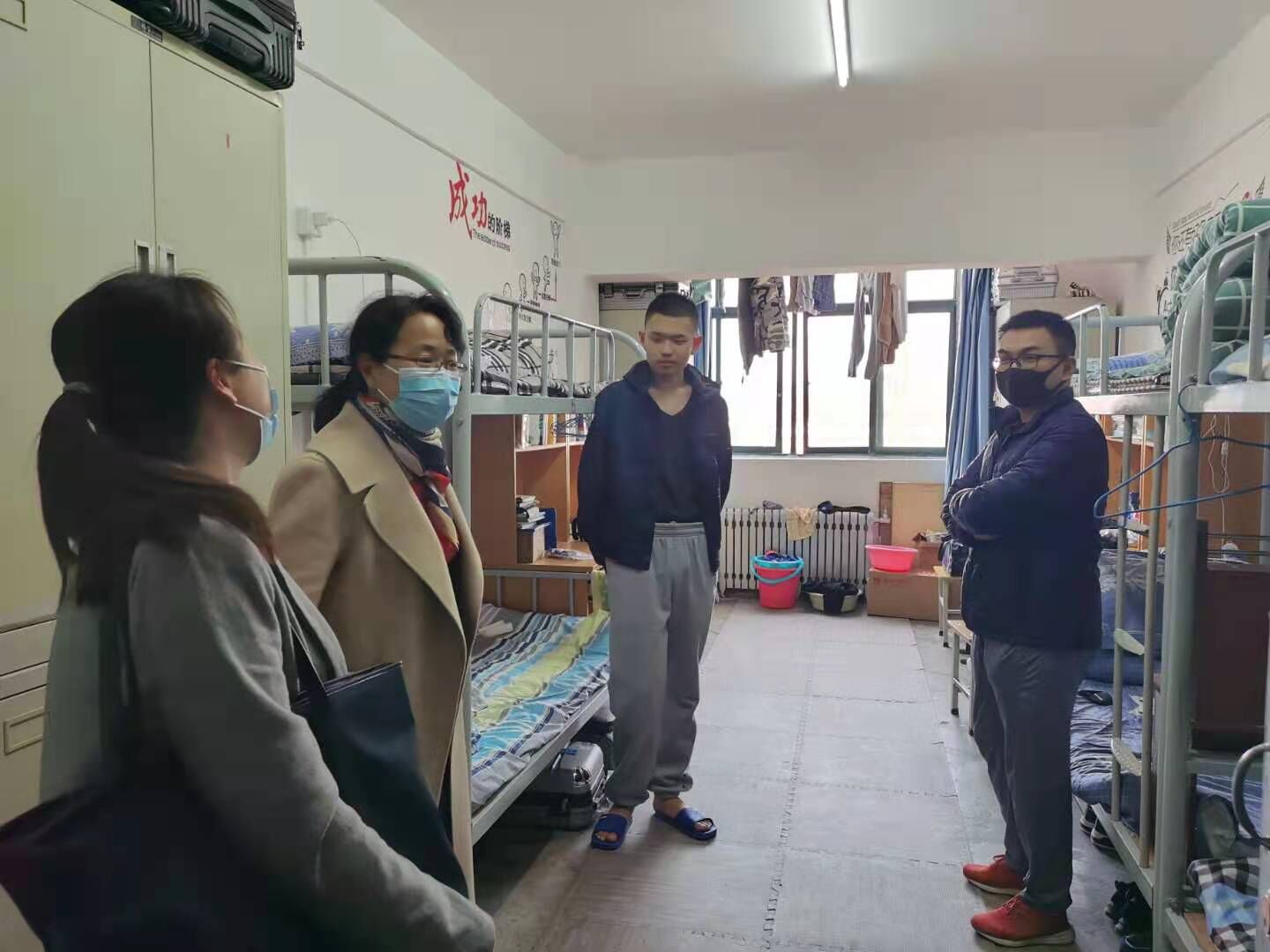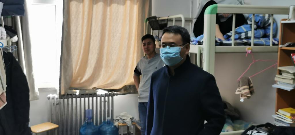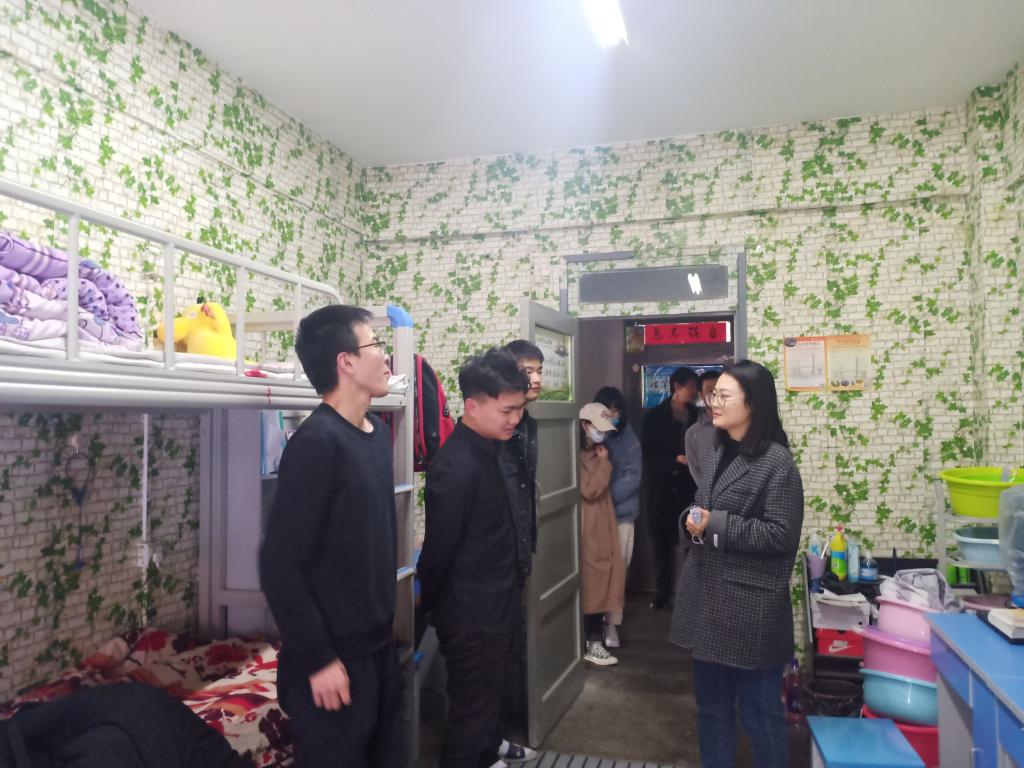 在走访中院领导与同学们进行了亲切交流,对同学们返校后饱满的精神状态表示肯定,并针对存在的问题和不足,结合新学期的要求提出四点建议:一是国内疫情防控形势虽积极向好,但同学们思想上不能麻痹,要持续做好个人防护和自我管理,养成良好的生活习惯,非必要不外出;二是返校后要及早收心,认真分析上学期取得的成绩和存在不足,明确新目标,新学期要有新气象;三是作为新时代青年要保持积极的心理状态,要有只争朝夕,不负韶华的劲头,勤奋刻苦,统筹安排好学习与课余生活之间的关系,积极奋发进取;四是要继续保持干净、整洁的宿舍舍容,营造温馨舒适的小家氛围,杜绝使用违规电器,确保用电安全。