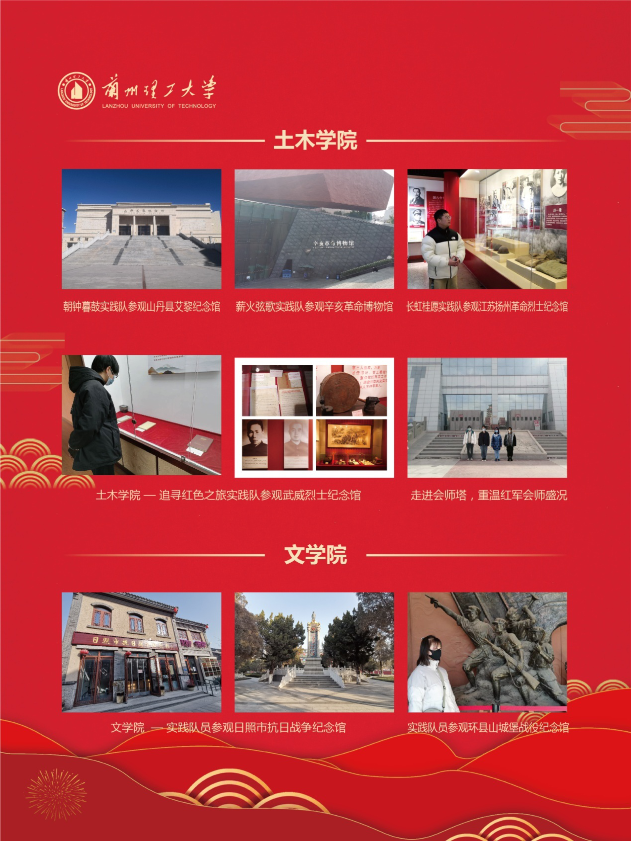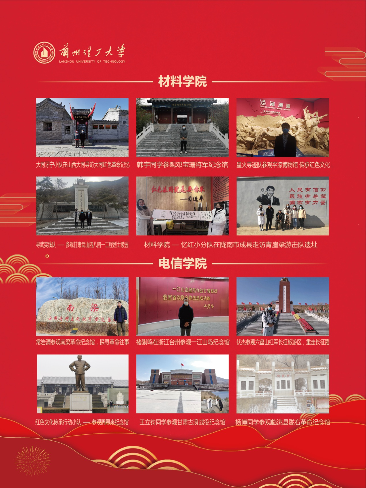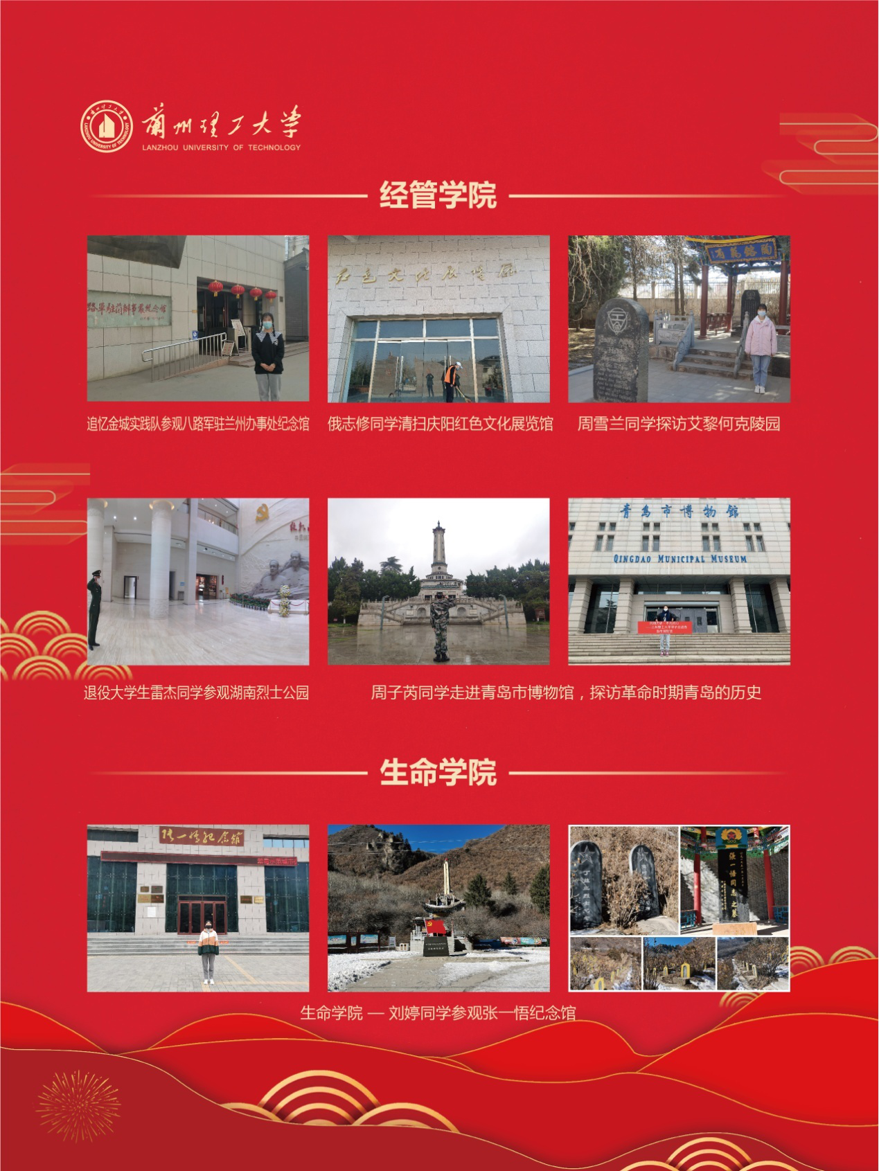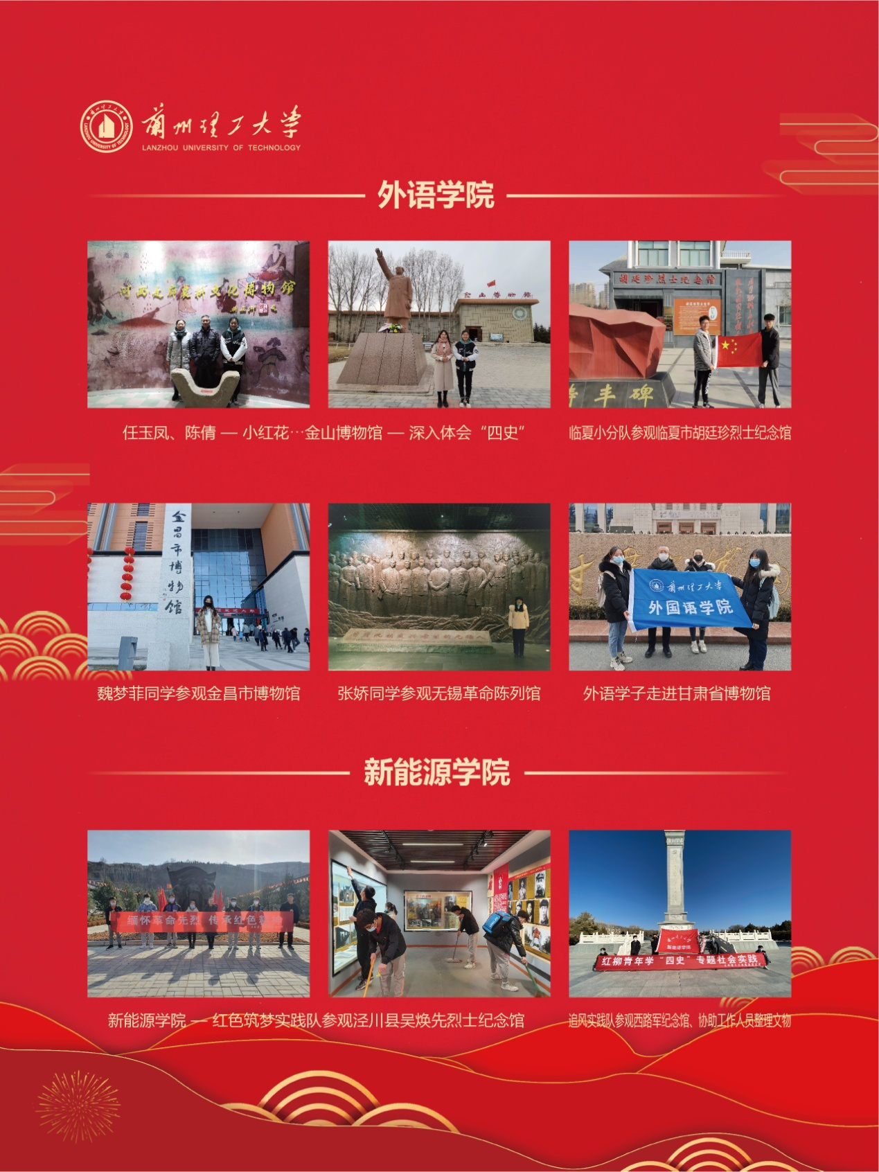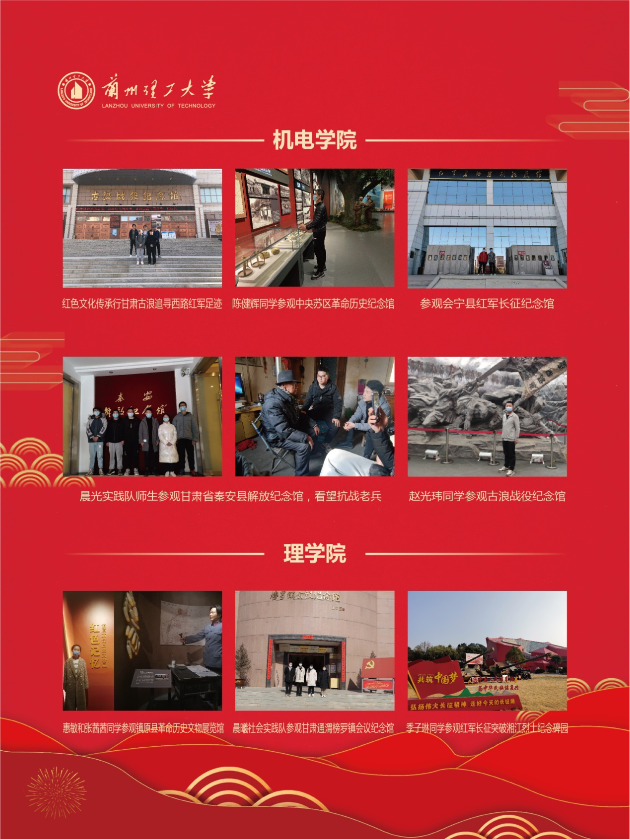 实践期间,各学院广泛动员,精心组织,全校1000余名同学,以生源地为主,通过参观生源地的革命纪念馆、展览馆、博物馆、工矿企业、开发区等地,以视频、图片等形式,记录所见、所闻、所思,并以微视频、推文、H5页面等形式宣传红色文化,讲述红色故事,感受国家发展历程。